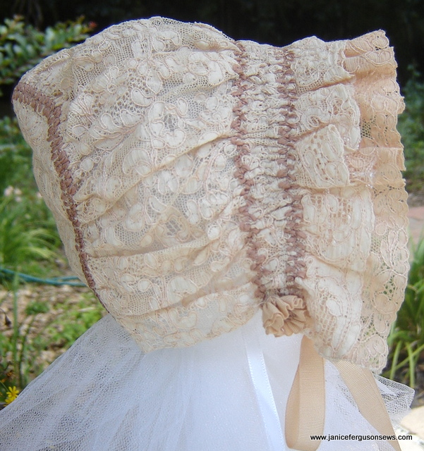 # —$25, size infant. Antique lace ruched bonnet with silk grosgrain ties.