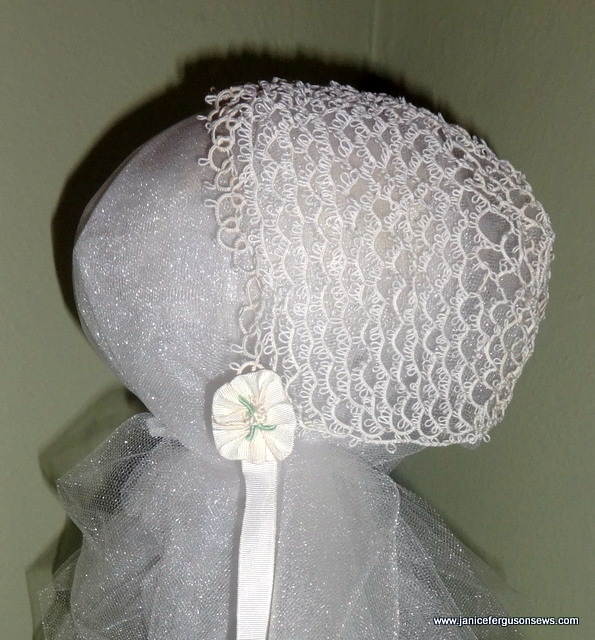 #119—$50, size newborn. This has been one of my dearest treasures, ordered 20 years ago from a student in one of my classes in Ohio, I think. It is tatted with fine thread. Never worn, as it turned up in a storage bin from when a hurricane destroyed half of our house and things were just thrown in bins. Never worn. It came with no ties. I have added antique silk grosgrain ribbon ties with an embroidered rosette. This seems small to me, but our babies all had heads that were off the charts. So I’m not a good judge. Still, it looks to be newborn.