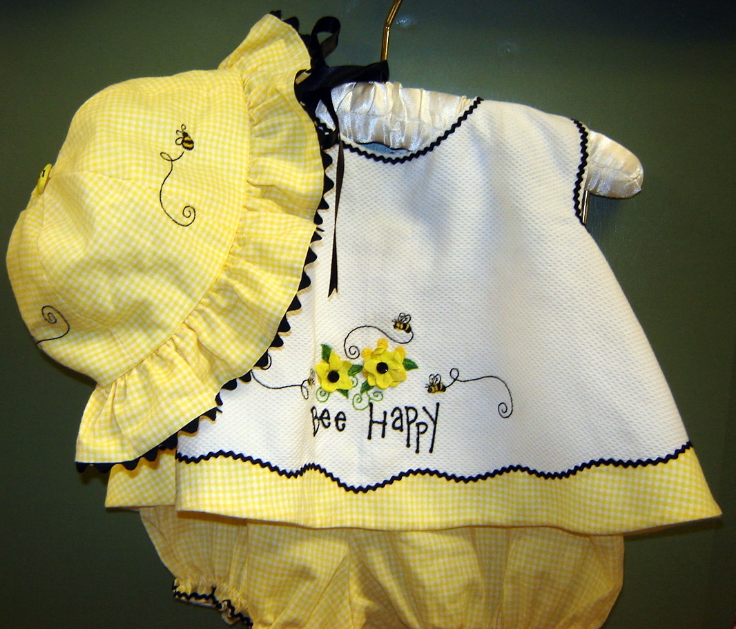 #88 Bee Happy set with shirt, bloomers and sun hat (Wendy Schoen’s Just Ducky pattern), size 3-6 months, $20. Pique with gingham, machine embroidery on hat and shirt. Used but in perfect condition.