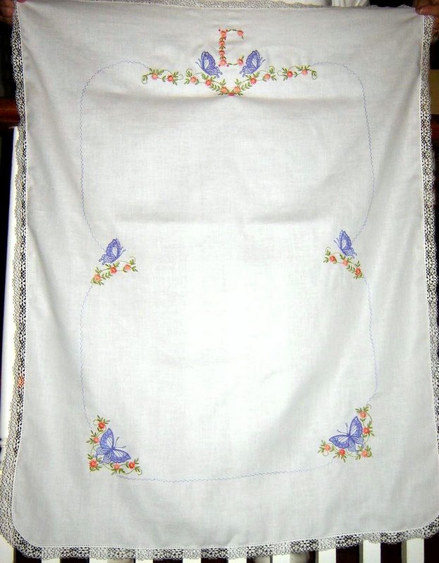 #44 Butterfly Shawl, $20. Gently used but much loved Swiss flannel shawl with machine embroidery and hemstitched heirloom lace edging. Monogrammed with C. Read more about it at Butterfly Blanket post.