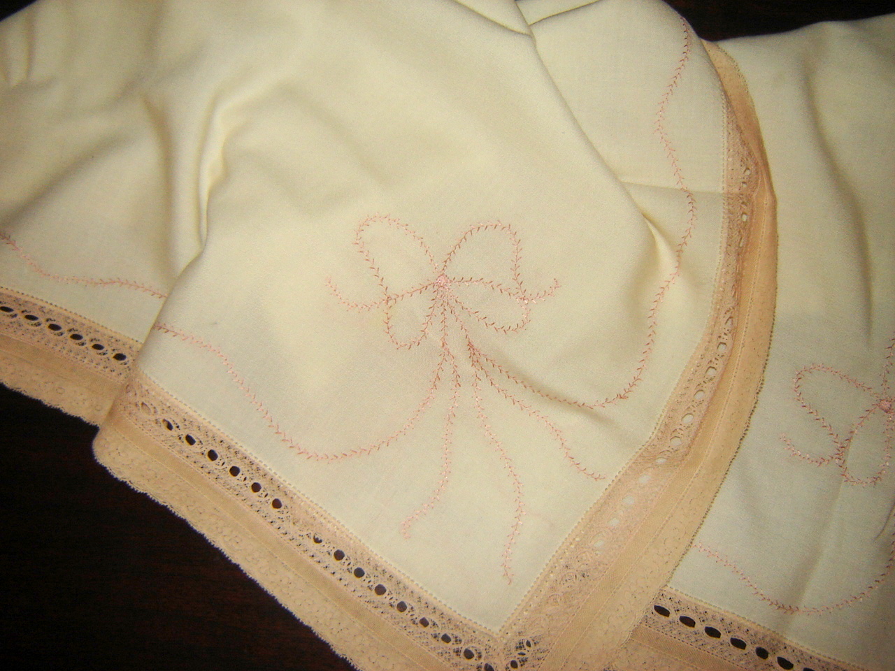 #76 Wool Challis Baby Shawl, $30. Trimmed with antique “biscuit” colored edging, lace tape and beading. Silk feather stitched bows withserpentine feather stitch on each side. 42″ square of challis, 2″ lace border.