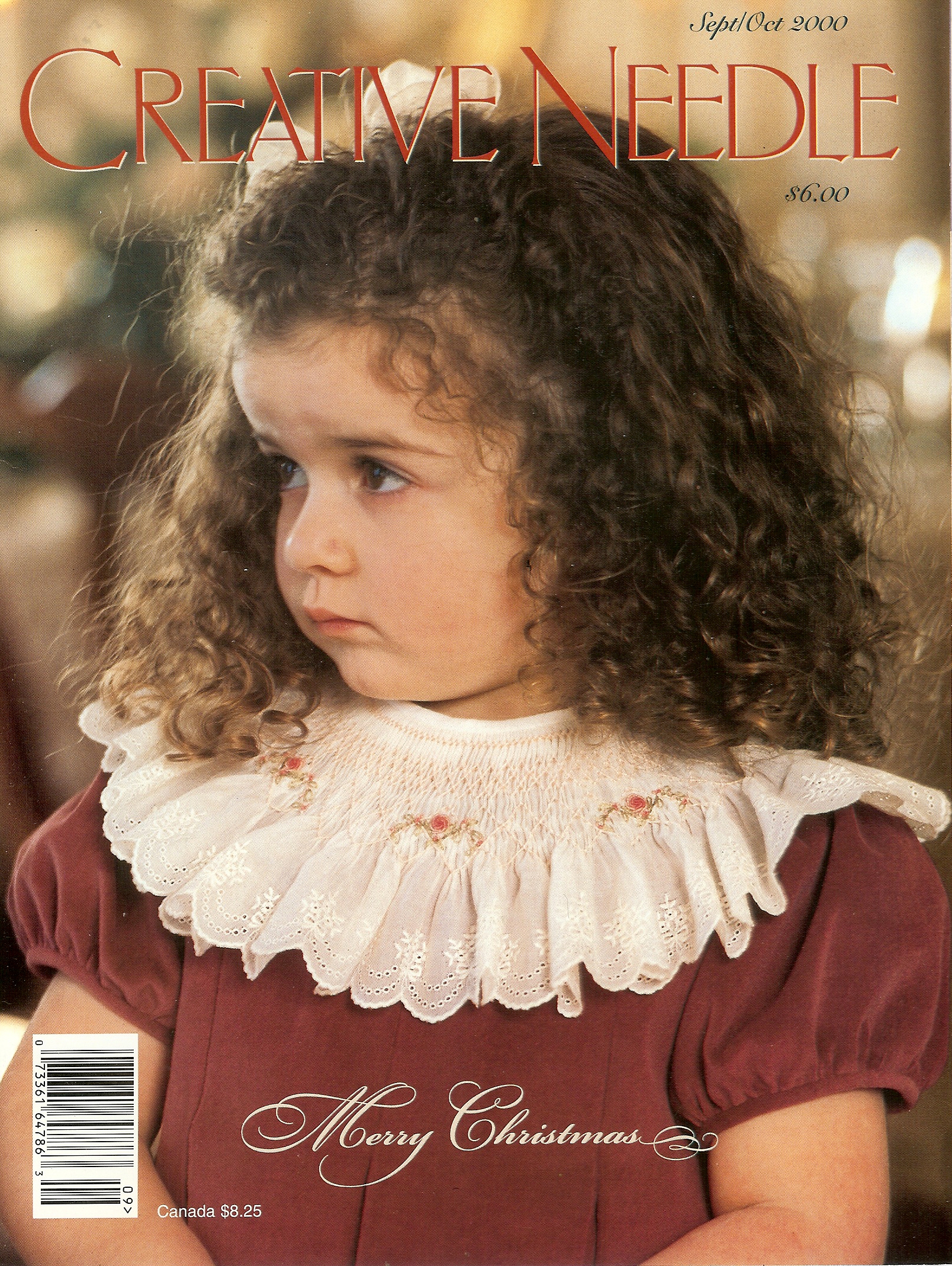 CN 2000 Holiday $3…Holiday Hand Towel~blank linen towel dressed up with shadow work bow, design on pull-out…. Waiting for St.Nick~pictorial featuring velveteen garments for girls and boys…. Merry Christmas~Christmas stockings, hand-crafted gift tags nad cards, velveteen cases for gifts or evening essentials……. Roses All Around~smocking plate and all directions, used on cover collar….. Velvet Cloud~This is the dress Judy Day used for her granddaughters’ Christmas dresses last year. Includes tips on pleating velveteen and instructions for adapting a split sleeve….. Fair Maiden~another smocking plate, a sophisticated design especially suited for a young lady, includes glass beads….. Old Fashioned Baby~ever popular Jeannie Baumeister displays a snowy white baby dress and gives instructions for faced joined ruffles. Includes an embroidery design…… Quick Stitch~heart shaped needle case