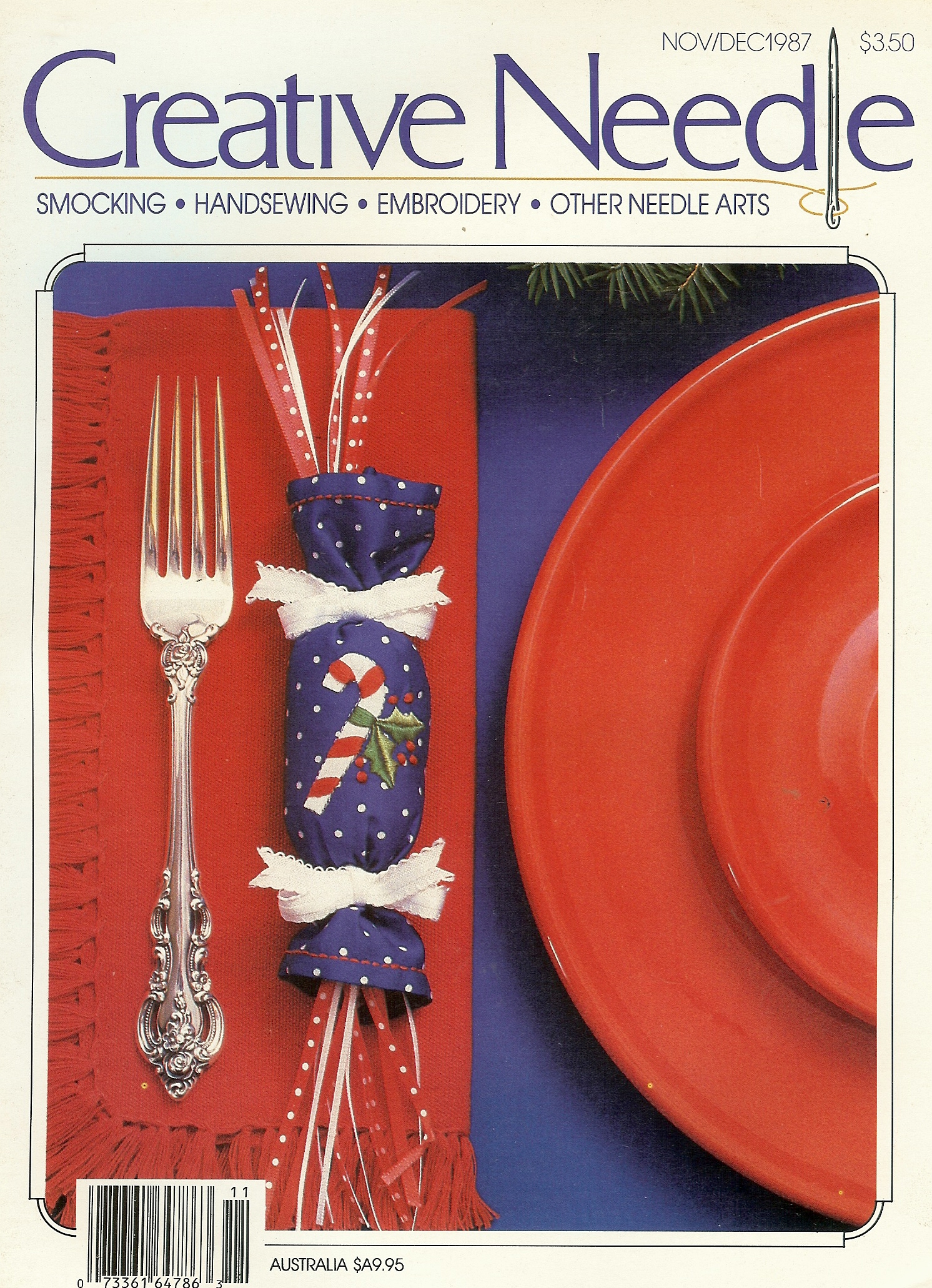 CN 1987 Holiday Nov./Dec $3….. In the South Tradition~interview with Betty Rast, original designer/owner of Belles and Beaus…….. Completing the Yoke block~Sarah Howard Stone……. Smocking with Silk Ribbon~includes Christmas Rose smock plate…… Baby Bunting~includes full size pattern and smock plate……. Holiday Stockings~patterns and instructions……. Christmas Crackers~a tradition to stitch (shown on cover)……… Blanket or Buttonhole Stitch~by renowned Marion Scoular….. Embroideries of Mamluk Egypt~counted thread …..How to Make a Basic Yoke Dress~part III by Chery Williams …..Smock Plate~waving Santas