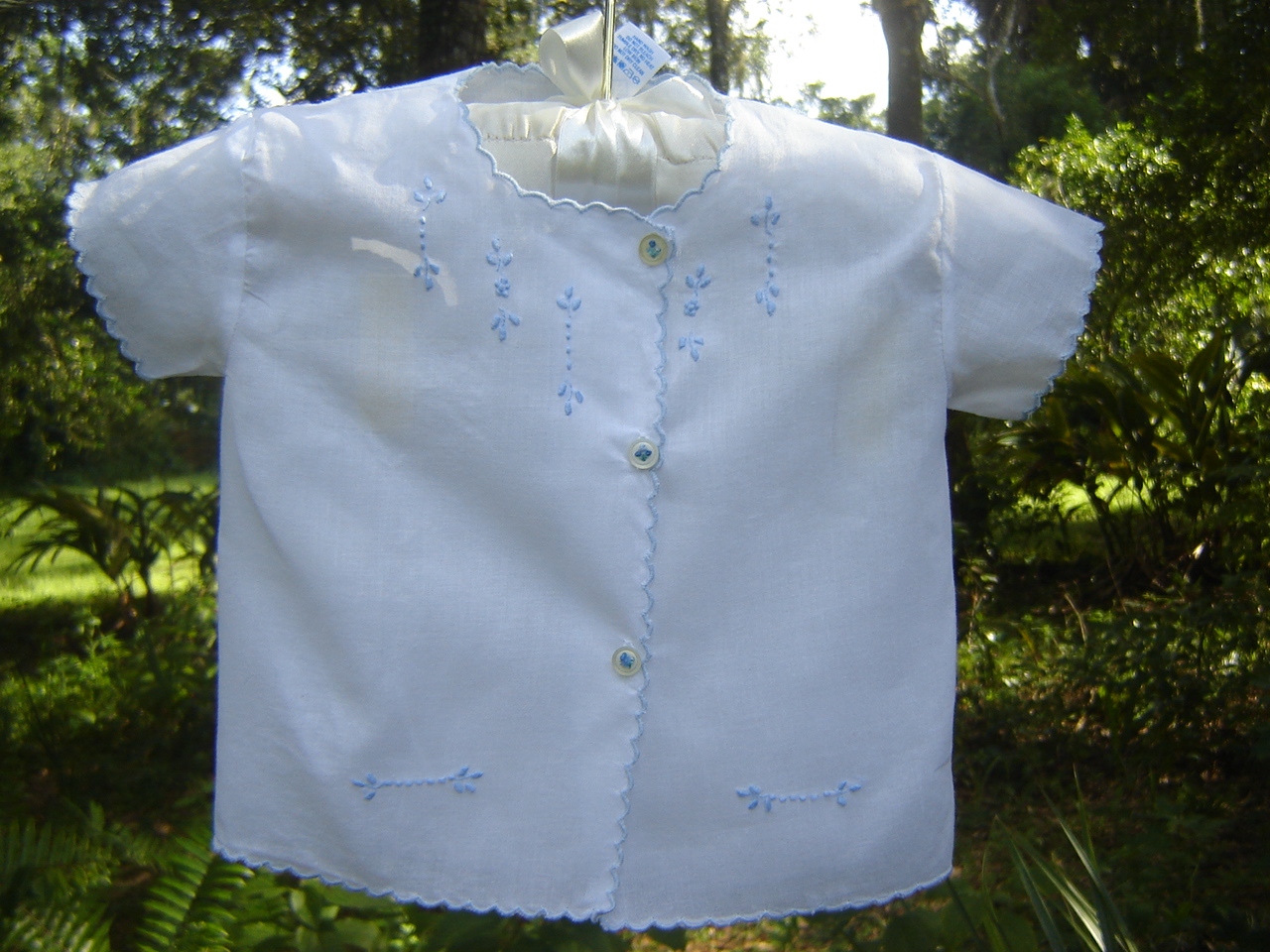 #80 Hand Embroidered Diaper Shirt, 3 months, $10. Easy care fabric, mother-of-pearl buttons, worn a few times but in perfect condition. More photos and info are posted here.