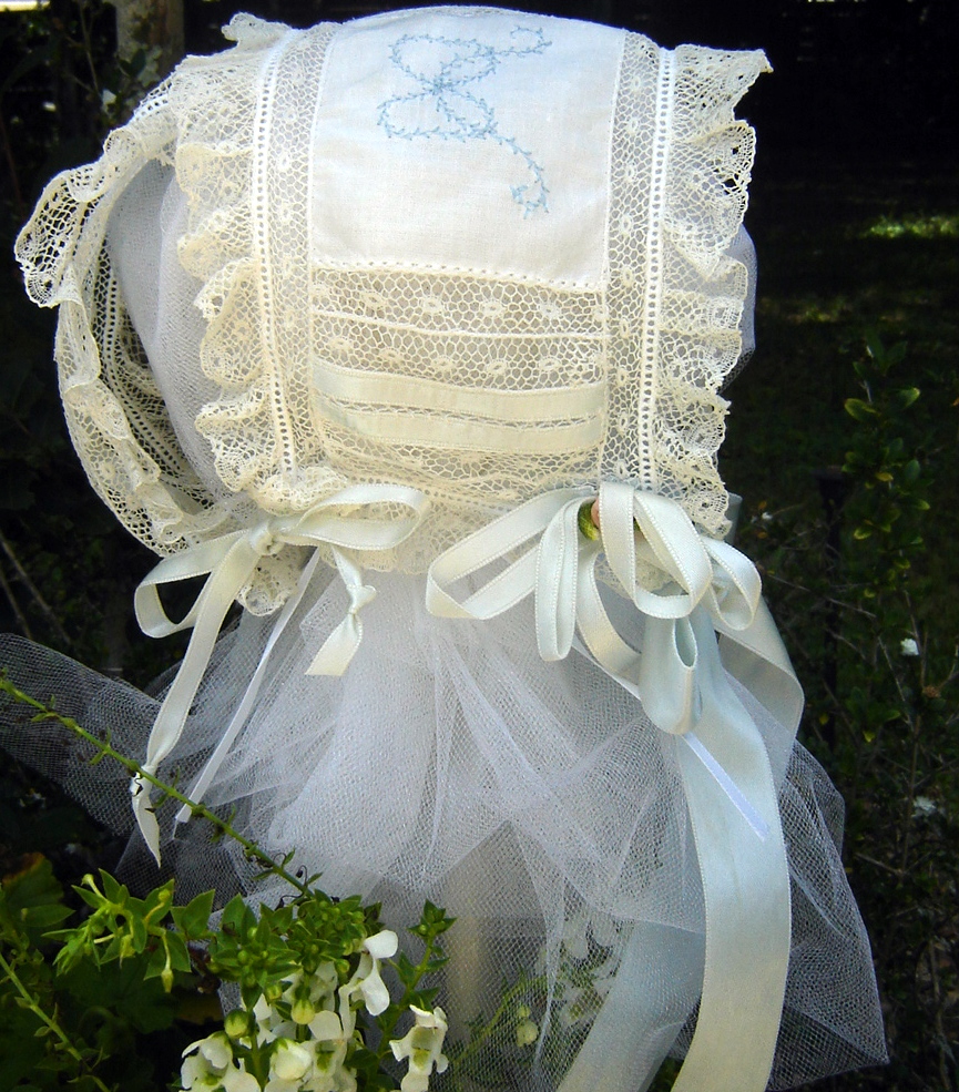 #71 Feather Stitched Bows T-Bonnet, $20. Swiss batiste, French lace. For more photos and pictures click here. http://www.janicefergusonsews.com/blog/2013/06/07/feather-stitched-bows/