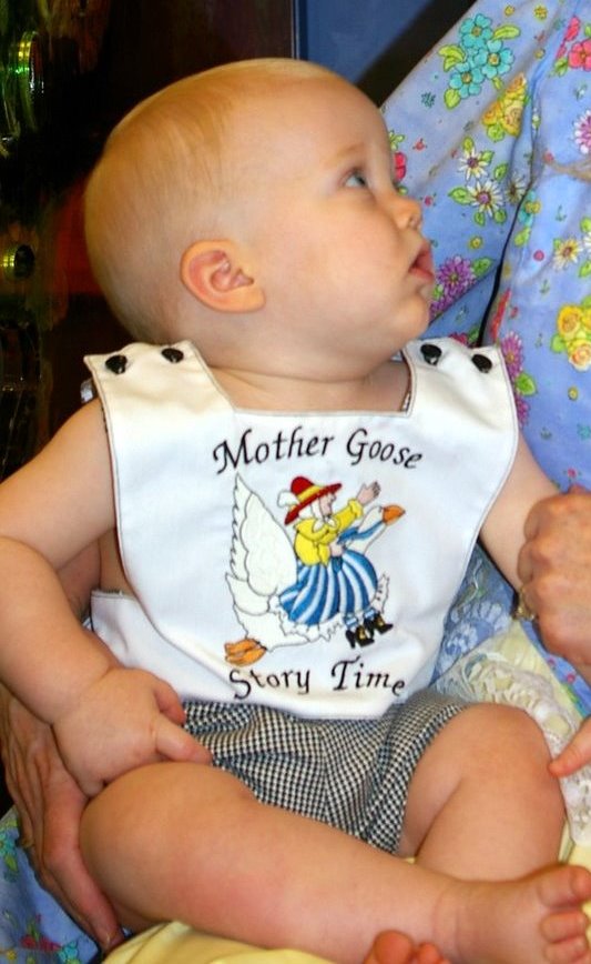 #50 Mother Goose Story Time, $10. Size 1, all cotton, lined CC Glenn with button-on bib. Used but in perfect condition.
