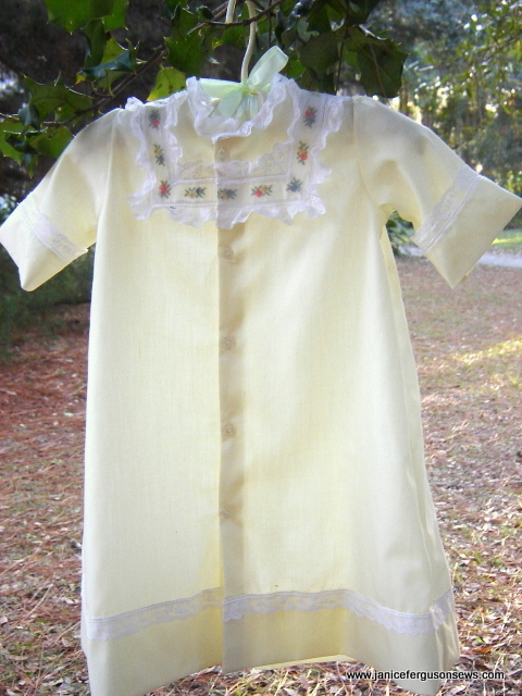 #11 Yellow Old Fashioned Baby’s First Daygown, $35 + shipping. Easy care Imperial batiste, antique petit point handloom insertion, French Maline lace edging, entredeux. Never worn……sigh. For more photos and details, read blog post OFB Daygown with petit point insertion.