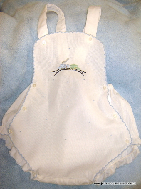 SOLD #17 Train Sunsuit, $21+ shipping. White Swiss pique with hand embroidered train and granitos. 3 months size, never worn, bought in Old San Juan. There is a tiny stain on a shoulder strap which might have been there when it was purchased.