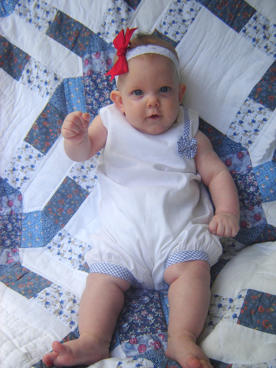 #77 Blue Check trimmed Bubble, 9 months, $15. Beautifully made of cotton sateen, trimmed in blue pima check.