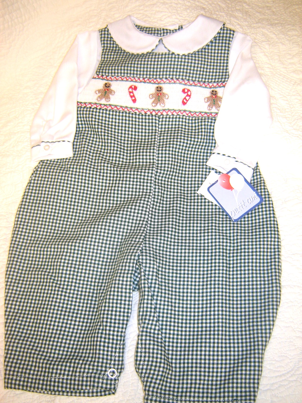 #29 Checked Christmas Romper, $25. Well done picture smocked 3 month romper with separate shirt, piped with checked fabric to match romper. Never worn, still has tags. mocked