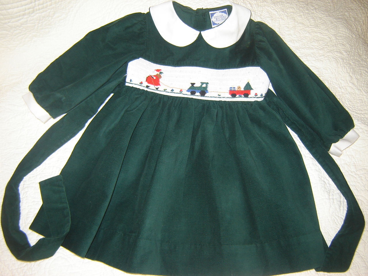 #21 Girl’s smocked Christmas dress, 12 months, $25. New, never worn, forest green featherwale corduroy with picture smocked insert. See matching 6 month girl and 3 month boy outfits.